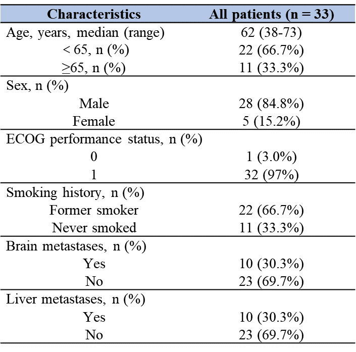 将2020年10月至2023年1月接受阿得贝利单抗联合放化疗治疗的33例ES-SCLC患者纳入研究分析,中位年龄为62岁(38-73岁),其中,28例患者为男性(84.8%),22例患者具有吸烟史(66.7%),32例患者ECOG PS评分为1(97%)。基线时,10例患者存在脑转移(30.3%),10例患者存在肝转移(30.3%)。